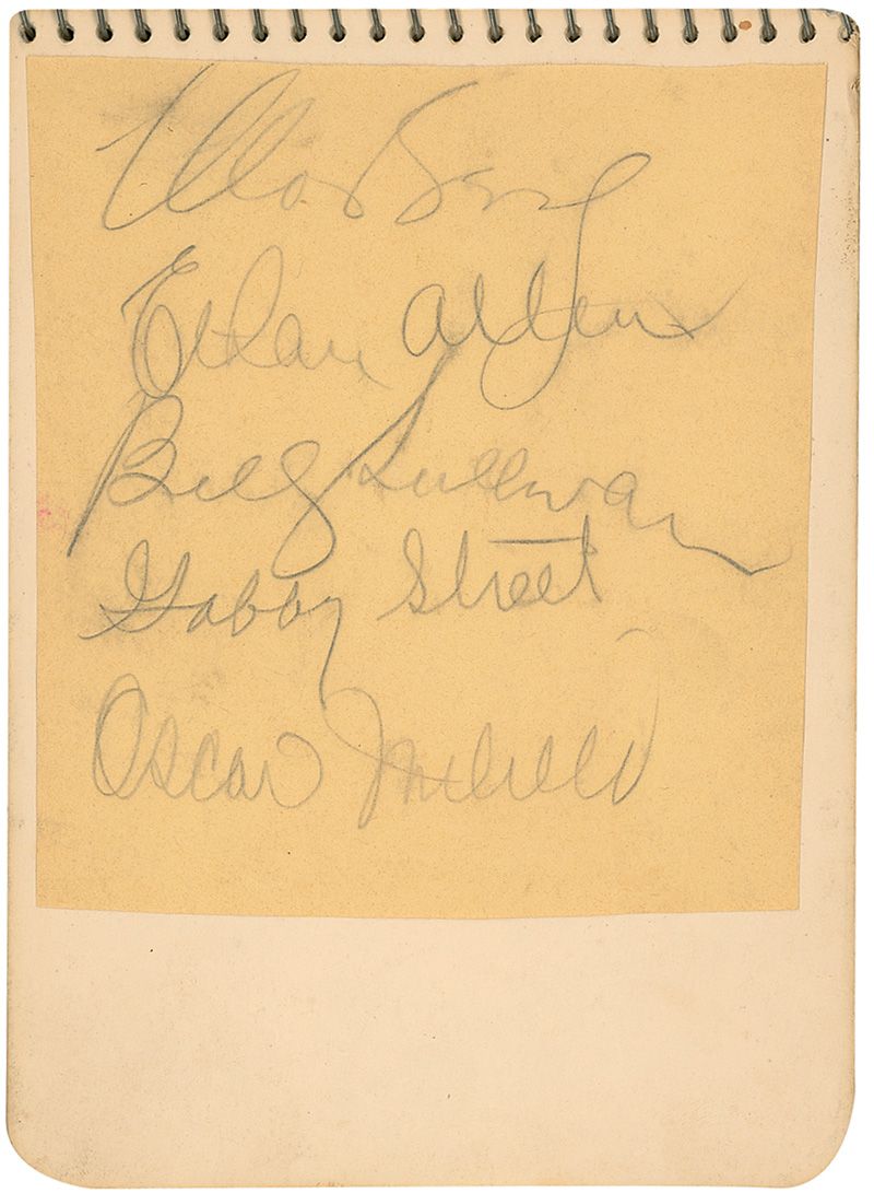 Vintage pencil signature, “Ted Williams,” on an off-white slip clipped from a baseball roster and a vintage pencil signature “Moe Berg,” on a 3.75 x 4.25 off-white slip signed by four others. Both are affixed inside their original spiral bound autograph album, along with 21 other pencil signatures, most on affixed slips including Lefty Grove. In fine condition, with some scattered light soiling to Berg’s slip.