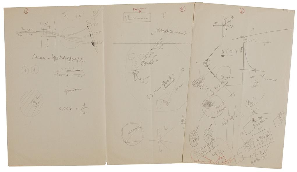 The next five pages have drawings and mathematical equations ostensibly diagramming atomic chain reactions. Berg has labeled one of Scherrer’s diagrams “aerodynamics another subject” and identified two of Scherrer’s words as “Prandle” and “Exterman of Geneva.” Thorium, written by both Berg and Scherrer is a source of nuclear power. In very good condition, with edge tears and creases, a couple fragile hinges, and a light central vertical fold.