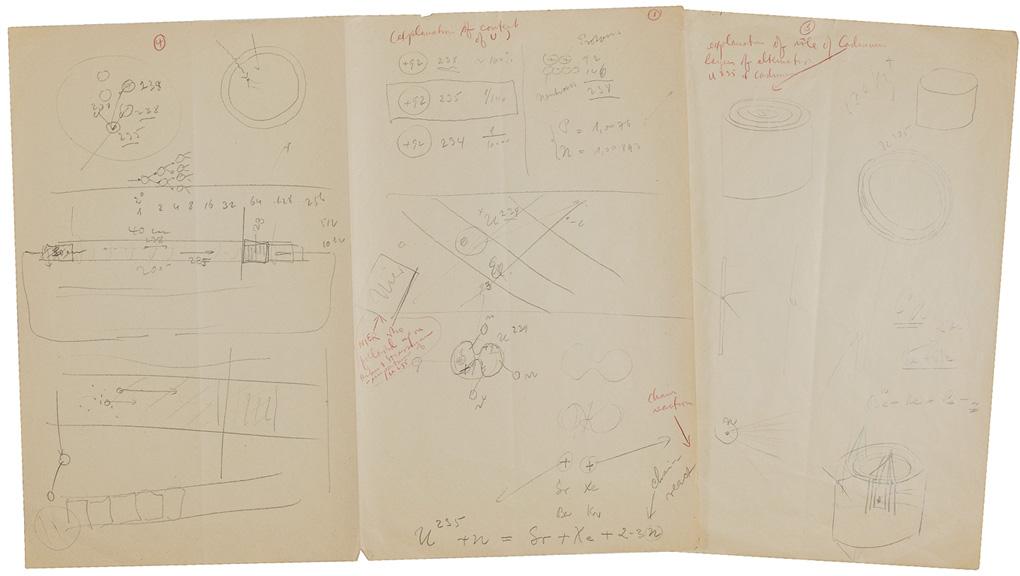 Uranium 239 first decays into Neptunium 239, further decaying into Plutonium 239. Scheerer has drawn a diagram in the center of the page, labeling “U 239” and drawing a box around the name “Nier.” Alfred O. C. Nier was the first to separate Uranium 235 from Uranium 238. In the lower third of the page, Scherrer has drawn and labeled diagrams and, at the lower edge, has written “U 235 + n = Sr + Xe + 2-3 n,” circling the final “n” and drawing an arrow to it labeled “chain reaction.” Berg has also written “chain reaction.”