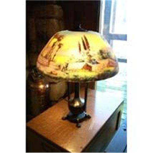 A signed Moe Bridges lamp (#194) with a reverse painted 18 inch diameter shade. The base and shade are both signed. The shade has a soft textured obverse and the colors and various scenes are great. Some of the original paint on the base has flaked off with age. This can easily be repaired by a good lamp restorer.