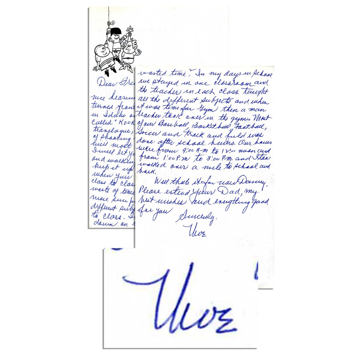 Handwritten signed letter from Moe Howard of The Three Stooges on Stooges letterhead. Though undated, the letter mentions a pilot for ''Kook's Tour,'' which the ''Boys'' filmed in 1968. The letter to ''Friend Danny'' focuses on school related topics. It reads in part: ''...In my days in school we stayed in one classroom and the teacher...taught all the different subjects...I too walked over a mile to school and back...Sincerely Moe''. Single sheet, written on both the front and verso, measures 5'' x 8''. Near fine condition.