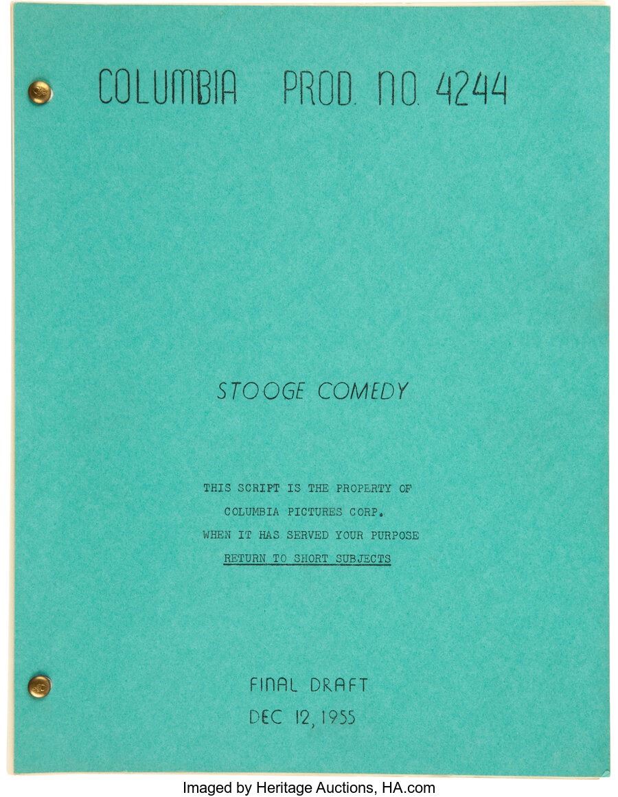 Moe Howard's Script For The Three Stooges' "Rumpus in the Harem" (1955). Moe Howard's nine-page final draft script, written by Jack White. Dated December 12, 1955 for the Three Stooges' "Rumpus in the Harem" (with the working title "Diamond Daffy"). Held by brads. Measures 8 ½" x 11". In Near Fine condition. COA from Heritage Auctions.