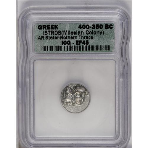 <B>Moesia, Istros.</B></I> Ca. 4th century B.C. AR drachm (16 mm). Facing male heads, the right inverted / Sea-eagle flying left, grasping dolphin with talons; monogram below. SNG BM 242; SNG Stancomb -. XF45 ICG.