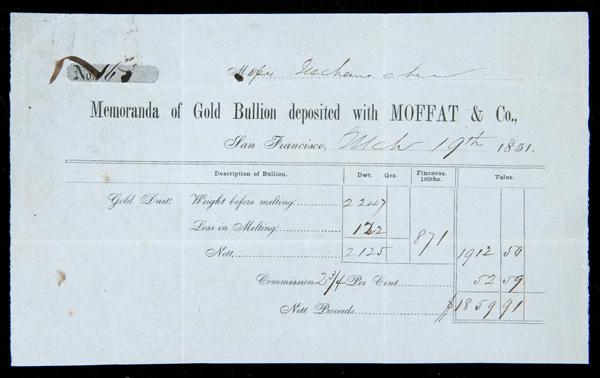 All ephemera from Moffat is Extremely Rare…only one letter from him has been located, and only four bullion receipts, one in the Henry Clifford Sale, and the others in private hands. There was not a single piece in tyhe prestigious John J. Ford Jr. Collection. These are arguably among the most desirable of all gold rush bullion receipts because of the importance of the Moffat gold coins minted at the beginning of the California Gold Rush.