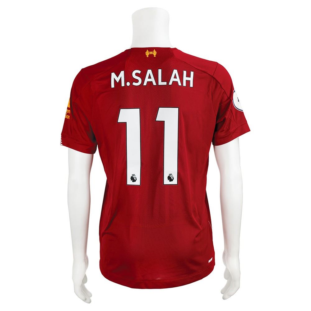 Official Liverpool F.C. home jersey worn by forward Mohamed Salah during a match in the 2019-2020 season. The Bob Paisley-inspired New Balance lightweight jersey, size medium/large, features the Liverpool emblem and sponsorship logos to chest area, the Premier League logo to right shoulder, and name, “M. Salah,” and number “11” to back. In fine condition, with expected wear from use. Accompanied by a certificate of authenticity from Marcos Moura Teixeira, a former technical coordinator for the Brazilian National Soccer Team, who affirms that the shirt derives from his personal collection. Considered one of the best players in the world, Salah is known for his finishing, dribbling, and speed. In his third season with Liverpool, he helped end the club's 30 year league title drought by winning the 2019–20 Premier League.