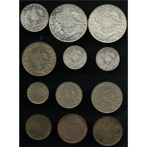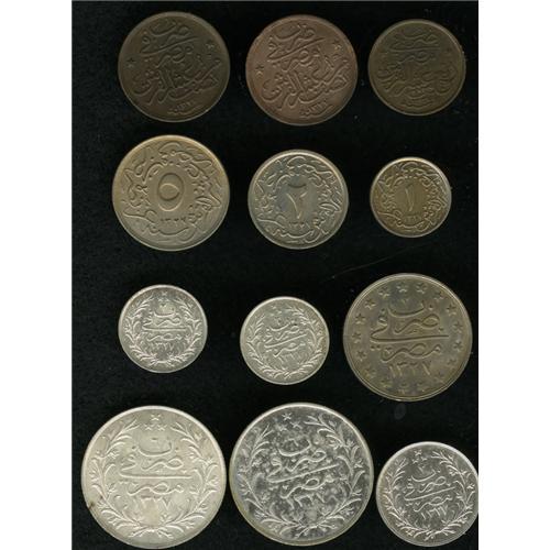 <B>Mohamed V 1327AH Type Collection, </B></I>KM300 1/40 Piastre Year 6H, brown XF, KM301 1/20 Piastre Year 4H, cleaned VF and 6H, brown XF, KM302 1/10 Piastre Year 4H, nice UNC, KM303 2/10 Piastre Year 4H, UNC, KM304 5/10 Piastre Year 4H, UNC, KM306 copper-nickel Piastre Year 2H, UNC, small spot, scarce date, KM305 silver Piastre Year 2H, two examples, cleaned XF and UNC, KM307 2 Piastres Year 2H, nice UNC, very scarce, and KM308 5 Piastres Year 6H, two pieces, cleaned VF-XF and choice brilliant UNC. <B>Sold as is, no return lot.</B></I>