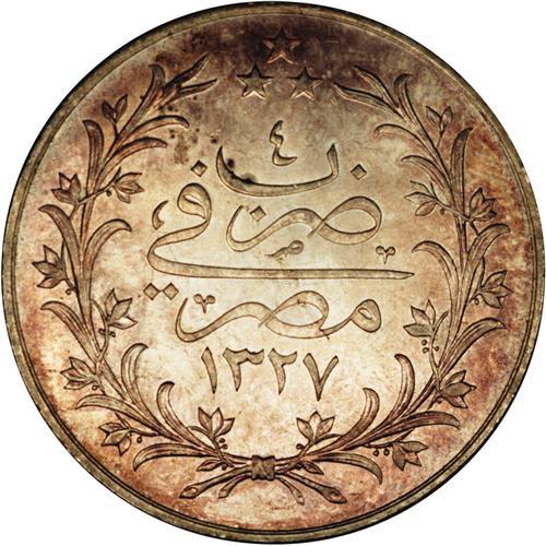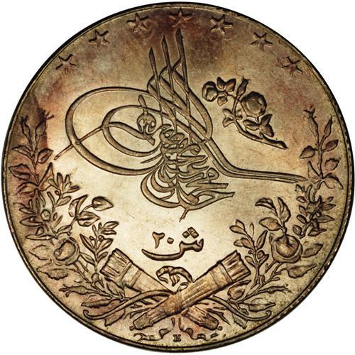 Mohamed V 20 Piastres 1327AH Year 4H, KM310, superb UNC Mohamed V 20 Piastres 1327AH Year 4H,