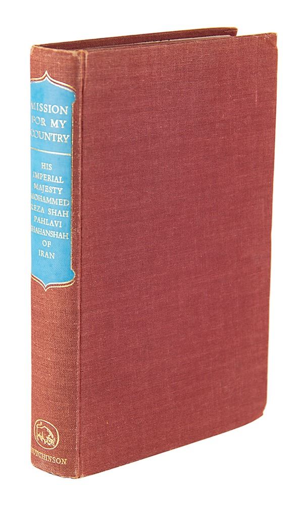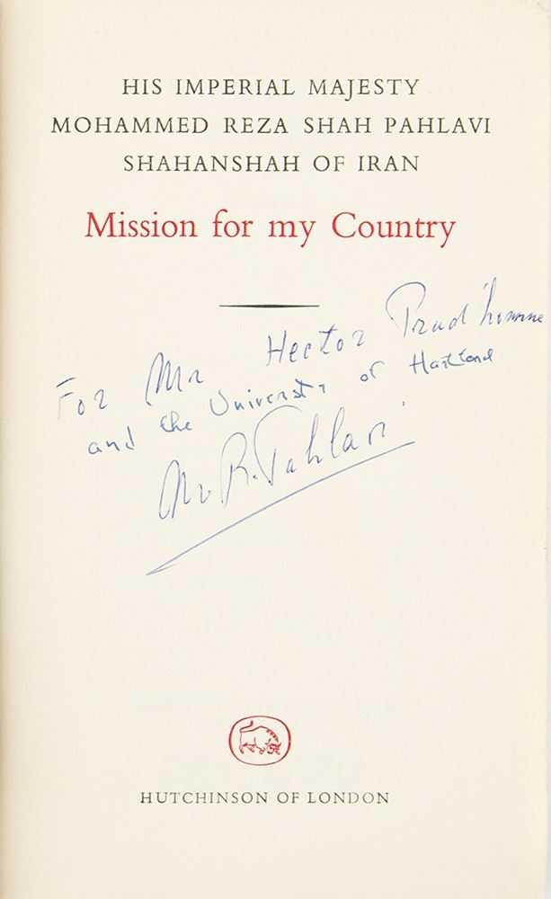 Signed book: Mission For My Country. First edition. London: Hutchinson, 1961. Hardcover, 6.25 x 9.25, 336 pages. Signed on the title page in black ballpoint, "For Mr. Hector Prud'homme and the University of Hartford, M. R. Pahlavi." In fine condition, with faint sunning to the spine.