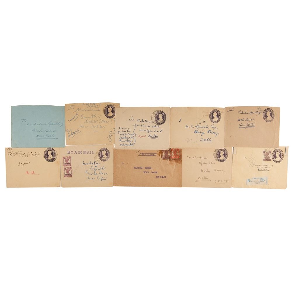 Unique collection of ten envelopes addressed to Mohandas Gandhi, most postmarked between 1947 and 1948, including several with delivery postmarks dating to mere weeks prior to his assassination on January 30, 1948. Most envelopes are addressed to "Mahatma Gandhi" at "Birla House, New Delhi," with other places including "Bhangi Colony, Delhi" and "Harigan Basti, New Delhi." In overall fine condition. Consignor notes that these envelopes originate from the estate of Indian freedom fighter V. Kalyanam, who worked with Gandhi at his ashram. Kalyanam was responsible for drafting replies to letters that Gandhi received.