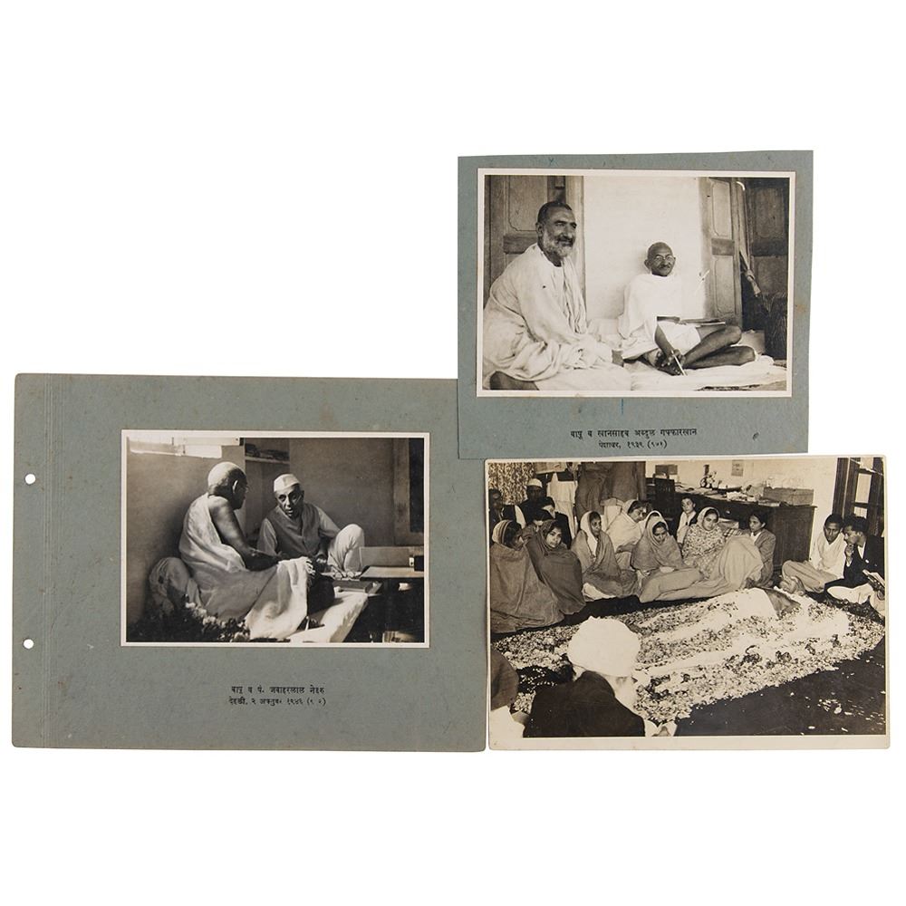 Three original vintage photographs of the revered Indian freedom fighter and pacifist Mohandas Gandhi, including: a glossy 6.25 x 4.5 photo of Gandhi with his friend and fellow non-violent resistor Abdul Ghaffar Khan, affixed to a slightly larger page with untranslated caption below; a glossy 4.25 x 4.25 photo of Gandhi meeting with Jawaharlal Nehru, affixed to a similar page; and a glossy 8 x 6 photo of the late Mahatma covered by flowers at Birla House, New Delhi, India on January 31, 1948, surrounded by mourners. In this last photograph, Indian freedom fighter V. Kalyanam, who worked with Gandhi at his ashram and was the last personal secretary (1943–1948) to Mahatma Gandhi, is seen sitting near Gandhi's head, wearing black coat and placing his right hand on his jaw. In overall fine condition, with several surface creases to the mourning photograph.