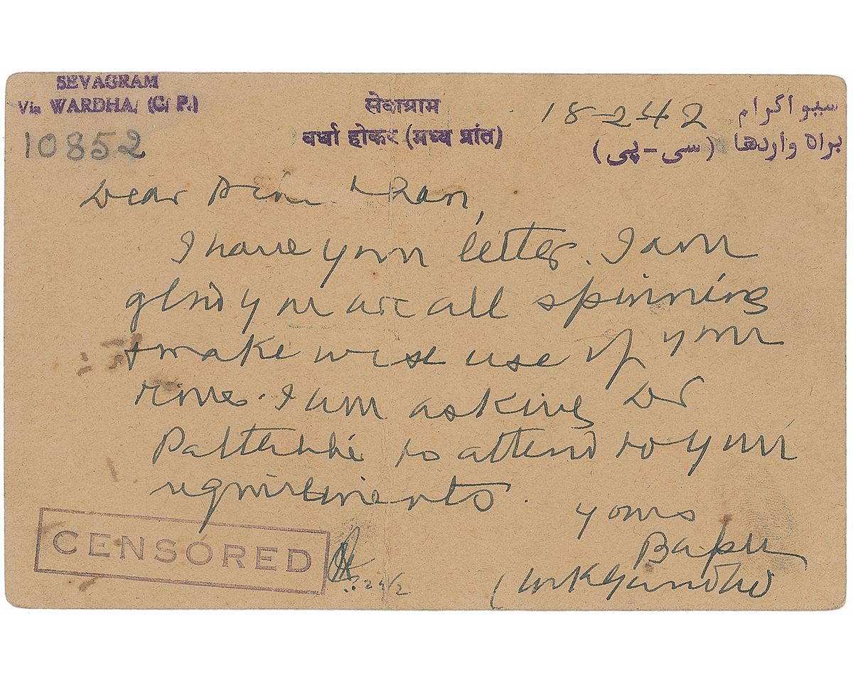 ALS in English, signed “Bapu (M. K. Gandhi),” one page on a 5.5 x 3.5 postcard, February 18, 1942. Letter to Sihri R. Achuthan, a freedom fighter, student revolutionary, and later a member of the first parliament of free India. In full: “I have your letter. I am glad you are all spinning & make wise use of your time. I am asking Dr. Pattahbi to attend to your requirements.” Addressed on the reverse to Achuthan at the Central Jail, Rajamundry, Andhra. A central vertical crease, a few small stains, and a fingerprint near the signature, otherwise fine condition.