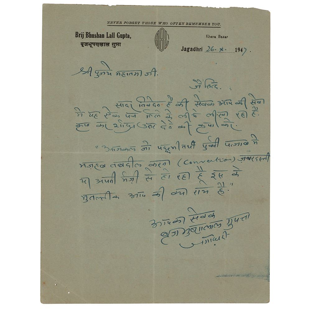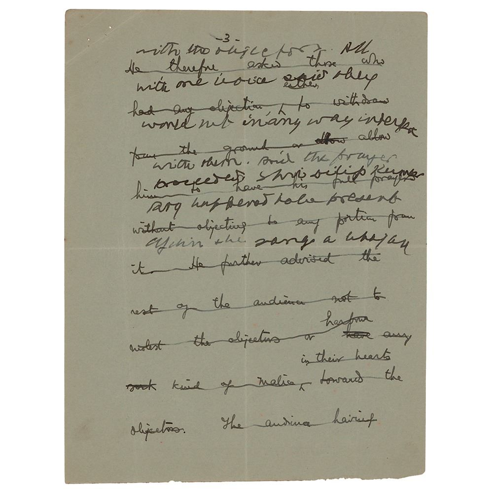 Partial hand-corrected manuscript by Mohandas Gandhi, one page, 6.25 x 8.25, on the reverse of a letter written in an unknown hand on Brij Bhushan Lall Gupta letterhead, October 26, 1947. Gandhi strikes through the entirety of the initial draft, marked as page "3" at the top, and pens a few lines in English. Gandhi writes, in part: "with the objector. All with one voice said they would not in any way interfere with them. And the prayer proceeded." The text evidently refers to objectors in the audience at one of his daily multi-faith prayer meetings at Birla House, which incorporated readings from the Quran, the Bhagavad Gita, and the Bible. In fine condition.