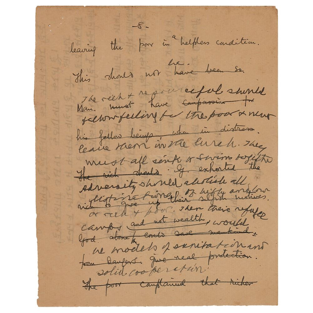Partial hand-corrected manuscript by Mohandas Gandhi, one page, 6.5 x 8.25, on the reverse of a letter written in an unknown hand. Gandhi strikes through several lines of the initial draft, marked as page "8" at the top, and pens a few lines in English pertaining to class and India's pervasive caste system. Gandhi writes, in part: "The rich & resourceful should [have] fellow feeling for the poor & never leave them in the lurch. They must all sink or swim together. Adversity should abolish all distinction of high and low or rich & poor. Then their refugee camps couple be models of sanitation and solid cooperation." In fine condition.