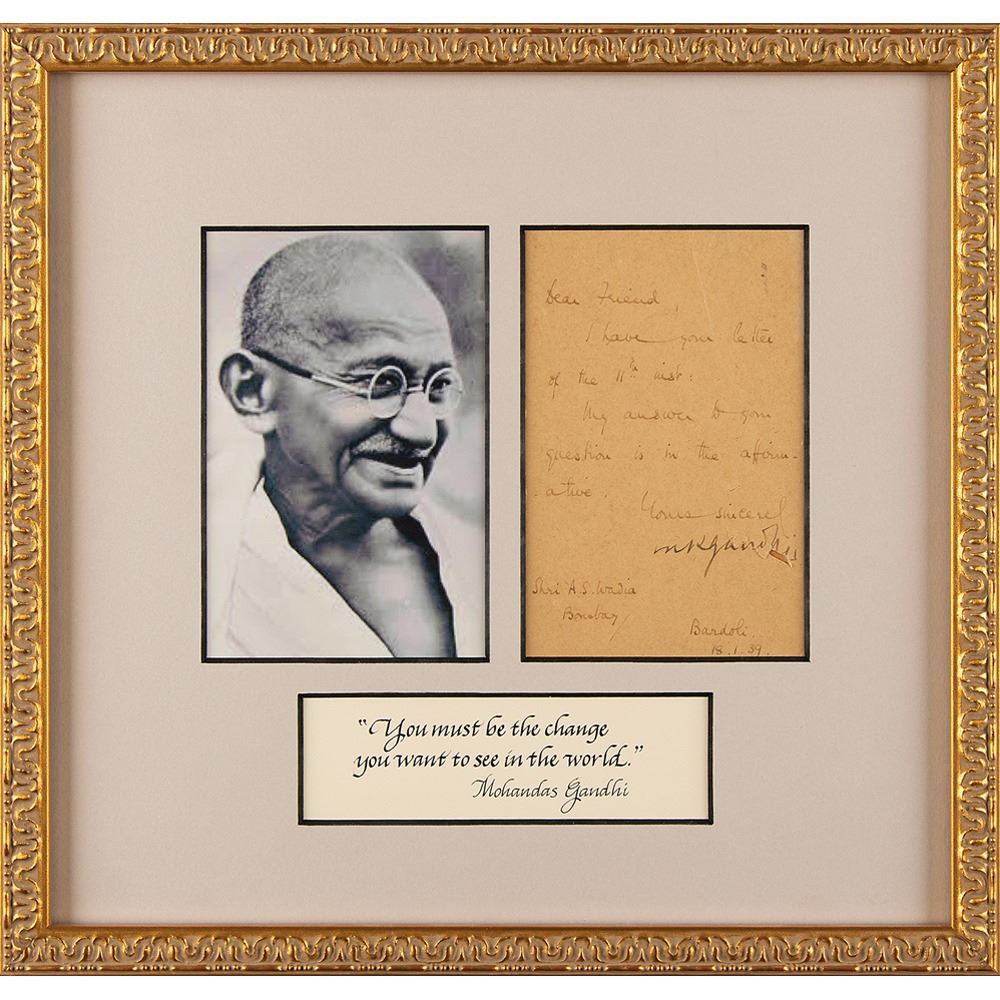 LS signed “M. K. Gandhi,” one page, 3.5 x 5.25, January 18, 1939. Letter to Shri A. S. Wadia in Bombay, in full: "I have your letter of the 11th inst. My answer to your question is in the affirmative." Matted and framed with a portrait and calligraphic quotation to an overall size of 12.25 x 11.75. In very good to fine condition, with a tear, and associated small area of paper loss, affecting Gandhi's last name.