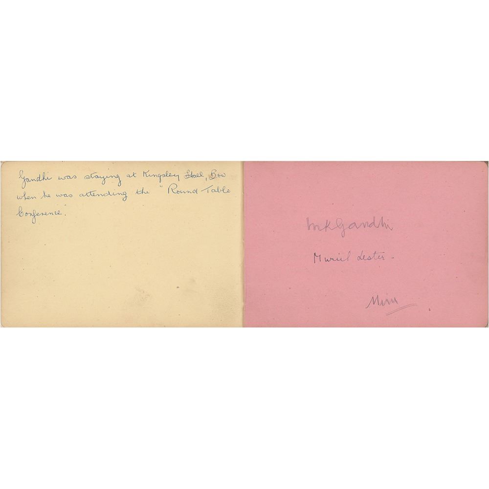Vintage pencil signature, "M. K. Gandhi,” on a pink 6.75 x 4.75 album page, also signed in pencil by his close companion, Mirabehn ("Mira"), and in ink by a fellow social reformer, "Muriel Lester." The opposite page is annotated in ink by the collector: "Gandhi was staying at Kingsley Hall, Bow when he was attending the 'Round Table Conference.'" Signed on the reverse of the page by Nellie Lansbury (who quotes a poem by Charles Mackay) and elsewhere in the album by Violet Lansbury, both daughters of British politician George Lansbury. In fine condition. Accompanied by a brief letter of provenance, in part: "Gandhi came to London in 1931 to attend a conference on India's future. He refused to stay at a hotel, living instead at Kingsley Hall in Bow where he slept on the floor! Kingsley Hall was a small independent church, founded by sisters Muriel and Doris Lester, doing social work in London's east-end…My parents…gave a lot of their time to Kingsley Hall and were able to get the great man's autograph."