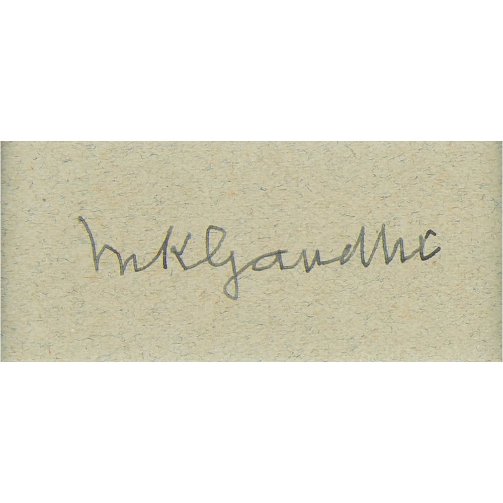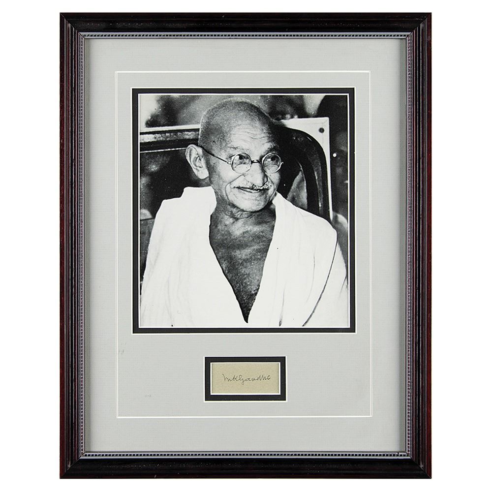 Beautifully displayed ink signature, "M. K. Gandhi,†on an off-white 2.25 x 1 slip, double-matted and framed with a portrait to an overall size of 12.25 x 15.5. In very fine condition.