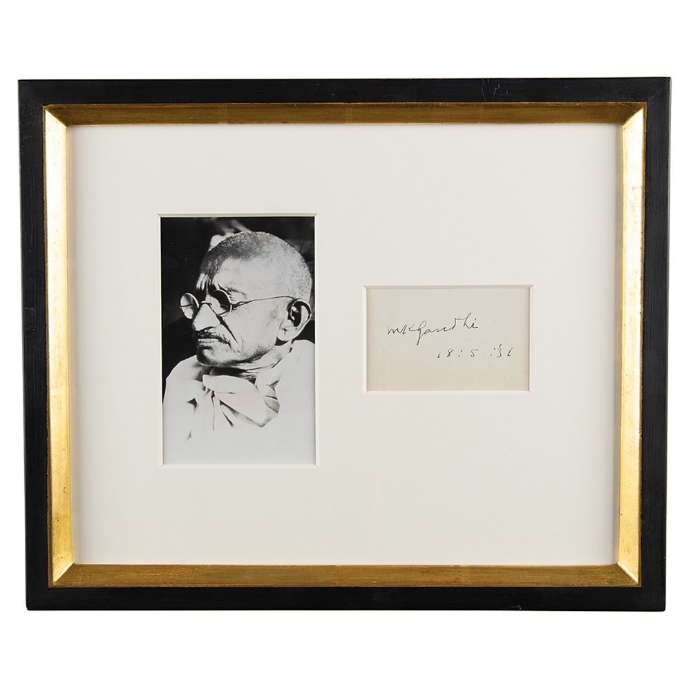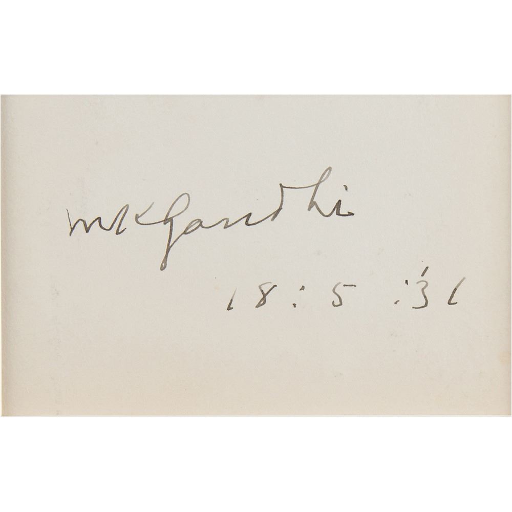 Clean ink signature, "M K Gandhi, 18:5:31,” on an off-white 3.75 x 2.25 sheet. Archivally matted and framed with a portrait of the Mahatma to an overall size of 14.75 x 12.25. In very fine condition.