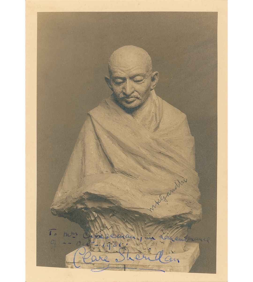 Vintage matte-finish 7 x 9.75 W. H. Grove and Son photo of Clare Sheridan’s bust sculpture of Gandhi, signed in fountain pen, “MK Gandhi,” and also signed and inscribed in fountain pen, “To Mrs. Cheeseman, in remembrance of —Oct—1931, Clare Sheridan.” In fine condition, with some scattered light silvering to background and darker areas of image. Sheridan was a noted sculptress, and cousin of Winston Churchill. Gandhi signed portraits seldom appear at auction, with the additional signature of the artist making this larger than usually seen photo a superior offering.