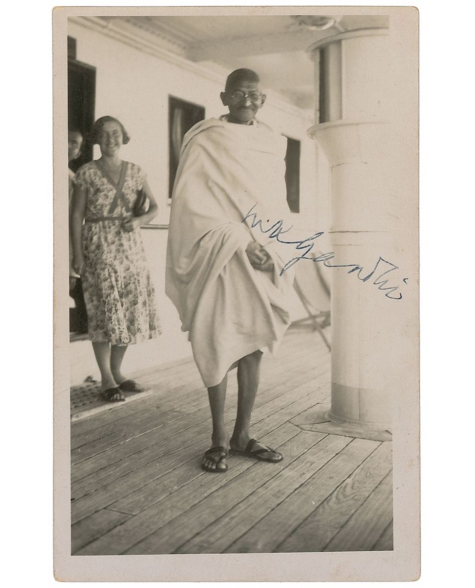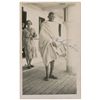Unique and extraordinary 3.5 x 5.5 real photo postcard of Gandhi in a full-length pose, wearing his iconic khadi garment and sandals, signed in fountain pen, “M. K. Gandhi.” In fine condition, with a few trivial creases. A choice image and bold signature of the influential pacifist.