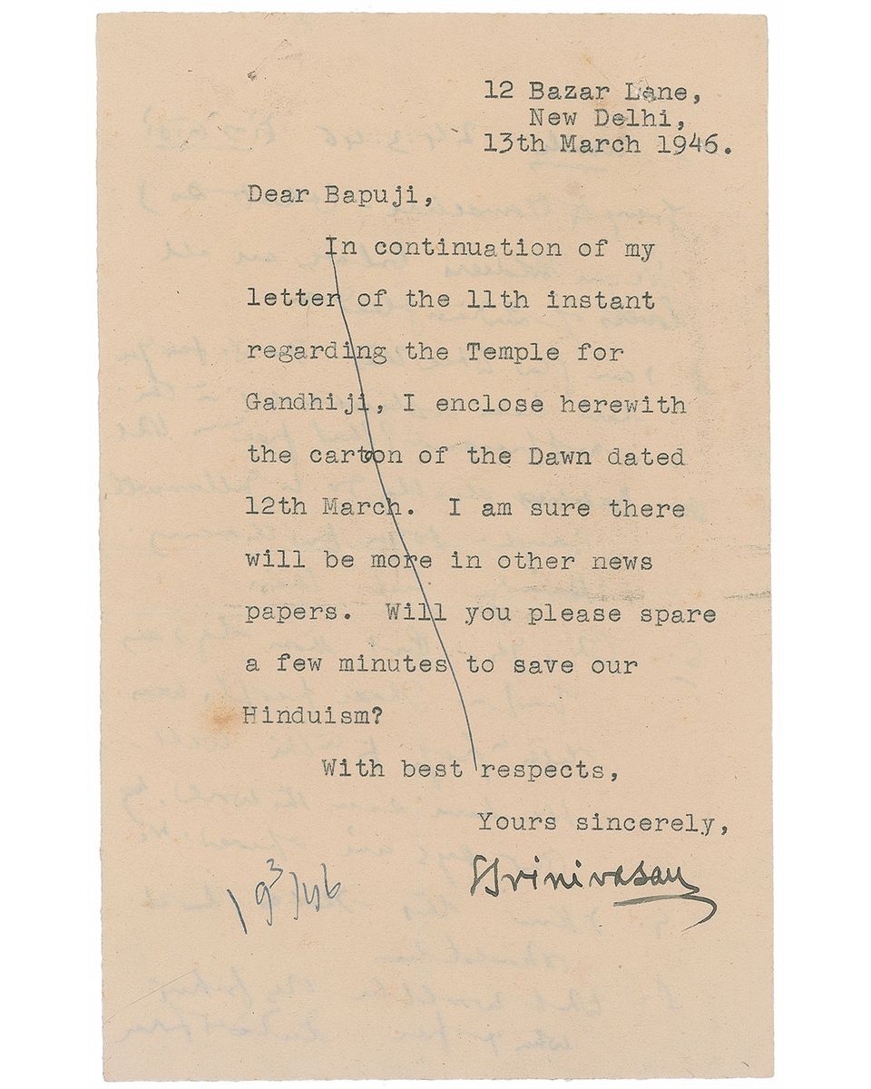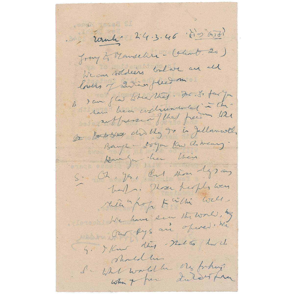 On March 24, 1946, a group of three British cabinet ministers arrived in New Delhi to negotiate a plan for the transition of power that would finally lead to Indian independence. These amazing handwritten notes from the same day seem to be Gandhi's own transcription of a conversation—one that he either took part in, overheard, or imagined—between Indians who had long struggled for freedom and soldiers of the British Raj. The most important part of the piece is the opening exchange, in which the soldiers say they are now "lovers of Indian freedom," to which an Indian responds by reminding them that British soldiers were responsible for decades of oppression, bringing up "Jallianwala Bagh"—a 1919 massacre of nonviolent protesters by the British Army. This massacre sparked the Non-Cooperation Movement, the first of a series of widespread nonviolent movements led by Gandhi. Under Gandhi's leadership, these peaceful campaigns were instrumental in winning Indian independence. Gandhi met with the cabinet ministers a few days after writing these lines, and after weeks of negotiation the officials came to an agreement under which power would be transferred from Great Britain to an Indian coalition government—the culmination of Gandhi's lifetime of work. An absolutely outstanding piece with fascinating content from a historically important date in Indian history.