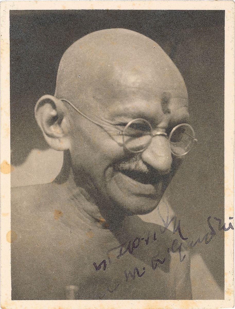 Extraordinary official circa 1942 matte-finish 3 x 4 candid portrait of Gandhi taken by his grandnephew, showing the bespectacled Indian leader shirtless and laughing heartily, signed in fountain pen in both Gujarati and English, “M. K. Gandhi.” Also signed on the reverse by the photographer, “Copy Right: Kanu Gandhi.” In fine condition, with scattered light spotting. Ex. Jerome Shochet Estate.