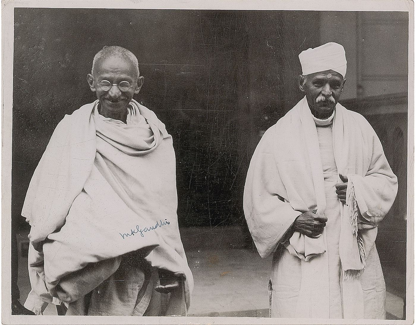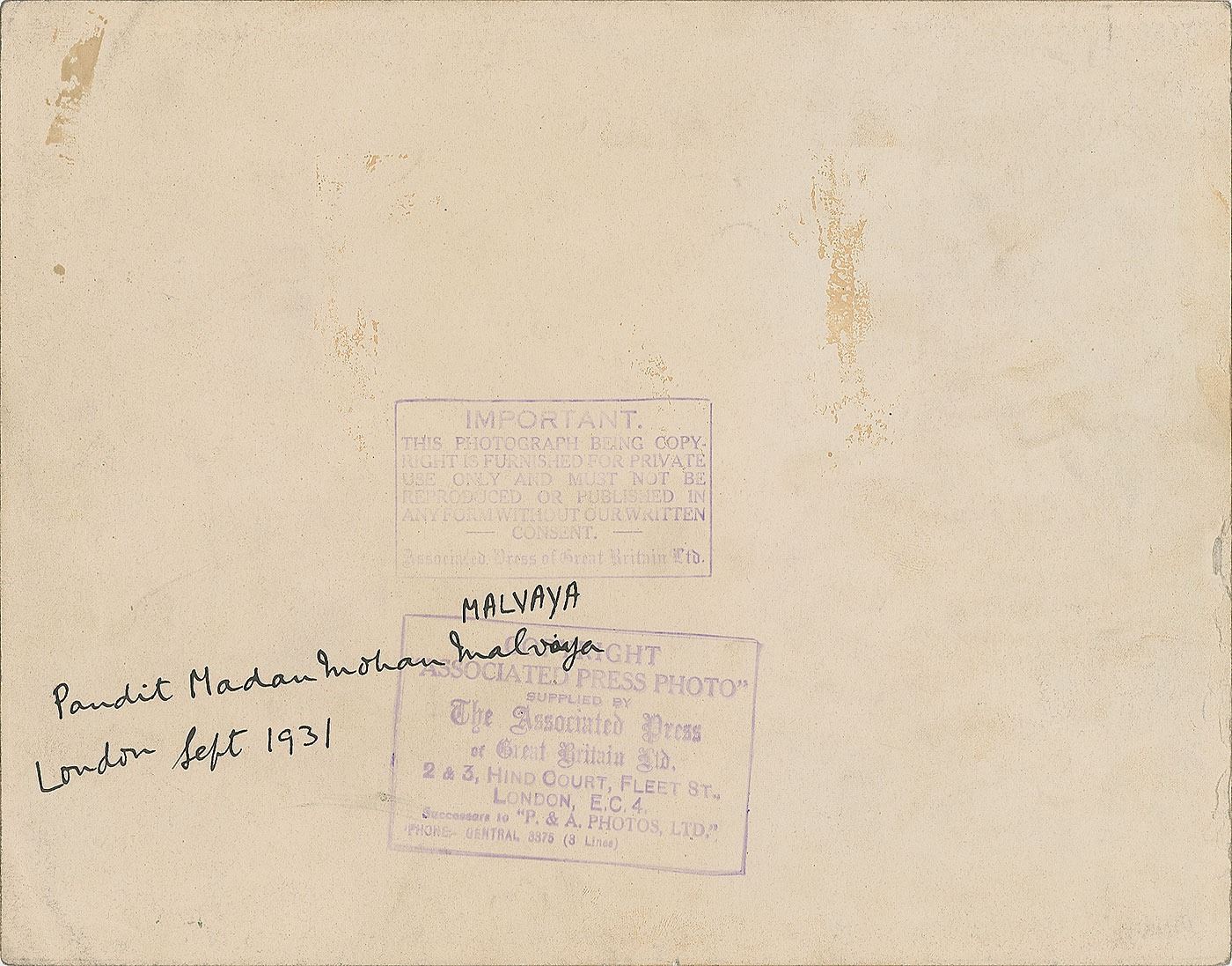 As the delegate acting on behalf of the Indian National Congress, Gandhi attended the second session of the British-organized Round Table Conference, a three-part conference series held in London from 1930 to 1932, with the aim of discussing the ongoing constitutional reforms in India. Malaviya, who had formerly been president of the Congress and played a significant role in the Gandhi-led non-cooperation movement, joined him as a representative advocating for a free India. From September 7–December 11, 1931, Gandhi issued several claims—Congress alone represented political India; the dalit, or 'untouchables,' were Hindus and not minorities; and that there should be no separate electorate for Muslims—all of which were rejected by the attending delegates. Unable to reach an agreement, Gandhi returned to India and was arrested in Bombay on January 4, 1932, for 'good and sufficient reasons.' Interestingly, this signed photo also dates to a period in which Gandhi, suffering from pain in his right thumb, opted to write with his left hand, a temporary inconvenience that lasted from August 8-December 19, 1931. Previously sold by Sotheby's of New York, December 1998.