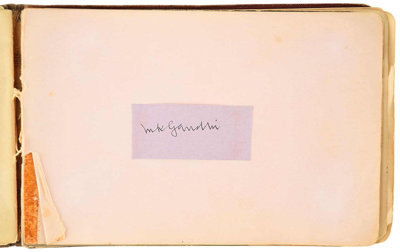 Vintage fountain pen signature, "M. K. Gandhi," on a purple 2.25 x 1 slip, affixed within an autograph album containing a variety of autographs from English entertainers (e.g. Basil Sydney, Ivor Novello, Evelyn Laye, and many others). In very good to fine condition, with the Gandhi page (like most pages in the book) detached, but clean. Consignor notes that this album belonged to actress Bertha Sydney, who met Gandhi during his tour of England in 1931.