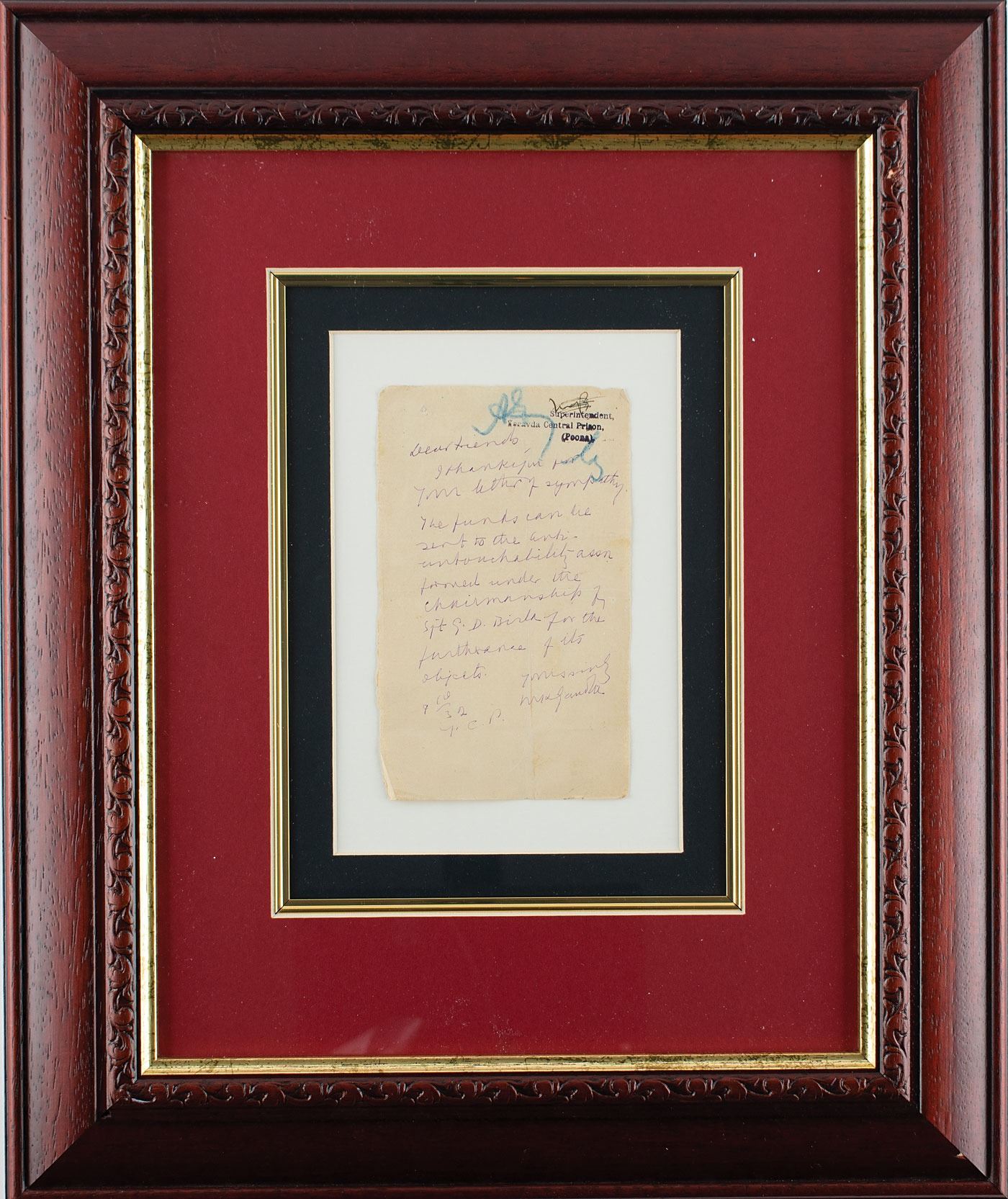 ALS signed “M. K. Gandhi,” one page, 4 x 6.5, October 9, 1932. In full: "Dear friends, I thank you for your letter of sympathy. The funds can be sent to the anti untouchability assn formed under the chairmanship by Sjt. G. D. Birla for the furtherance of its subjects." Beautifully mounted, double-matted, and framed to an overall size of 16.25 x 19.25. In fine condition, with intersecting folds and a tiny hole to the upper left blank area.