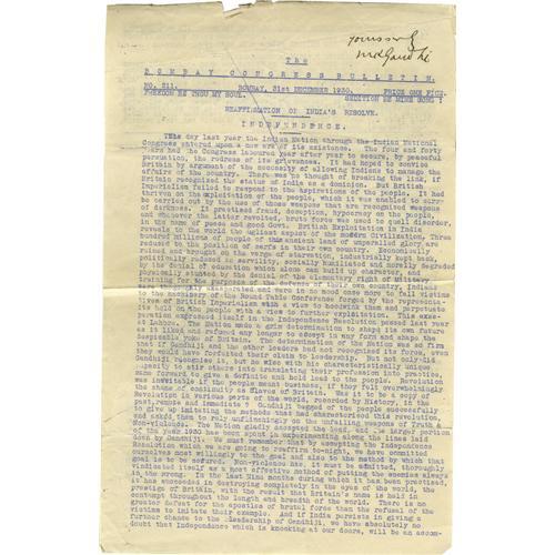 <B>Mohandas K. Gandhi, (1869-1948), leader of the Indian independence movement, his Signature</B></I> "<I>yours truly M. K. Gandhi</B></I>" at the top of a mimeographed copy of <I>The Bombay Congress Bulletin,</B></I> two pages, 8" x 13", Bombay, December 31, 1930. The bulletin provides a wonderful view into the independence movement, midway through the struggle, and reads in small part: "<I>British Exploitation in India reveals to the world the ugliest aspect of the modern civilization. three hundred millions of people of this ancient land of unparalleled glory are reduced to the position of serfs in their own country... this exasperation expressed itself in the Independence Resolution passed last year at Lahore. The Nation made a grim determination to shape its own future as it liked and refused any longer to accept in any form and shape the despicable yoke of Britain.... Non-violence has, it must be admitted, thoroughly vindicated itself as a most effective method of putting the enemies always in the wrong. In the last Nine months during which it has been practiced, it has succeeded in destroying completely in the eyes of the world, the prestige of Britain...</B></I>" More fine content. Small chip at top margin, usual folds, else fine condition. A nice specimen. From the Henry E. Luhrs Collection. Accompanied by LOA from PSA/DNA. <BR><BR><B>Important notice:</