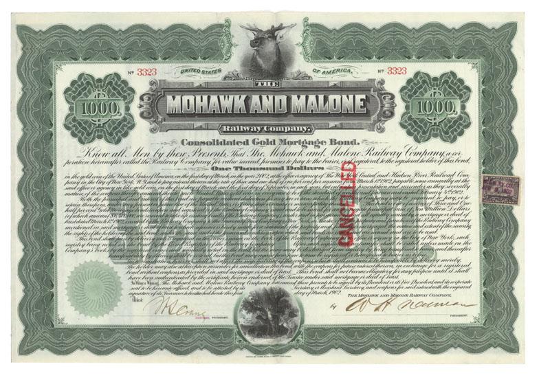 1902, New York. $1000 bond bearing 4% interest. Green/Black. Vignette of deer head at top center. Multiple deer in woods at bottom center. Stamp cancelled and fine.