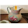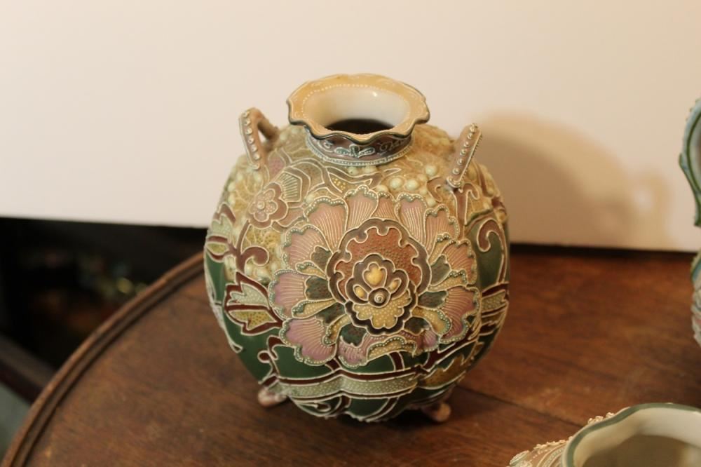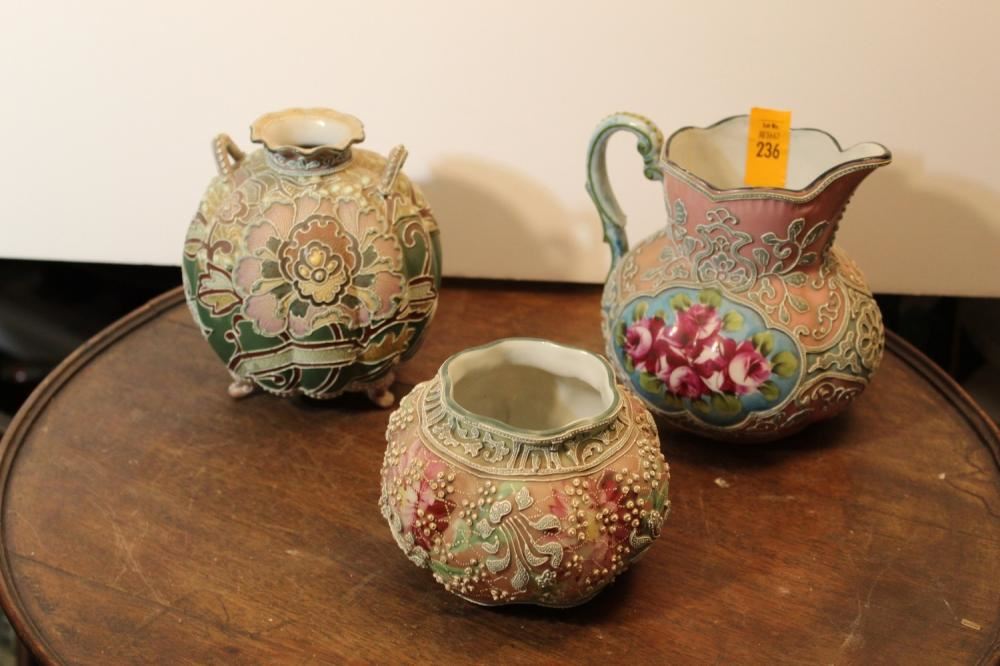 Japanese Moriage collection including 2 vases and pitcher. Pitcher measures approx. 6 inches tall