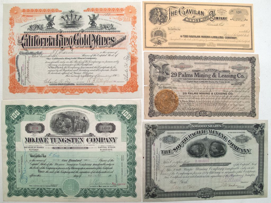 Five pieces; Southern Pacific Mining Company; Mojave Tungsten Company; The Galivan Mining & Milling Company; California Gold Mine Company; 29 Palms Mining & Leasing Co.
