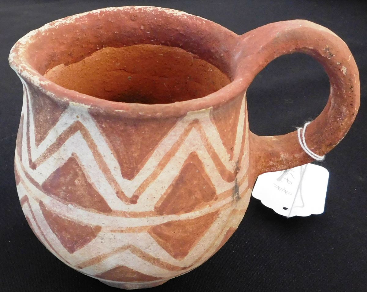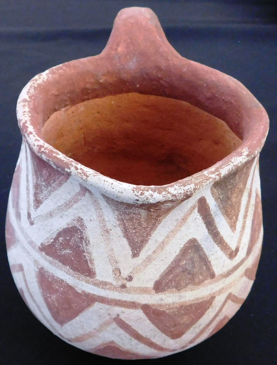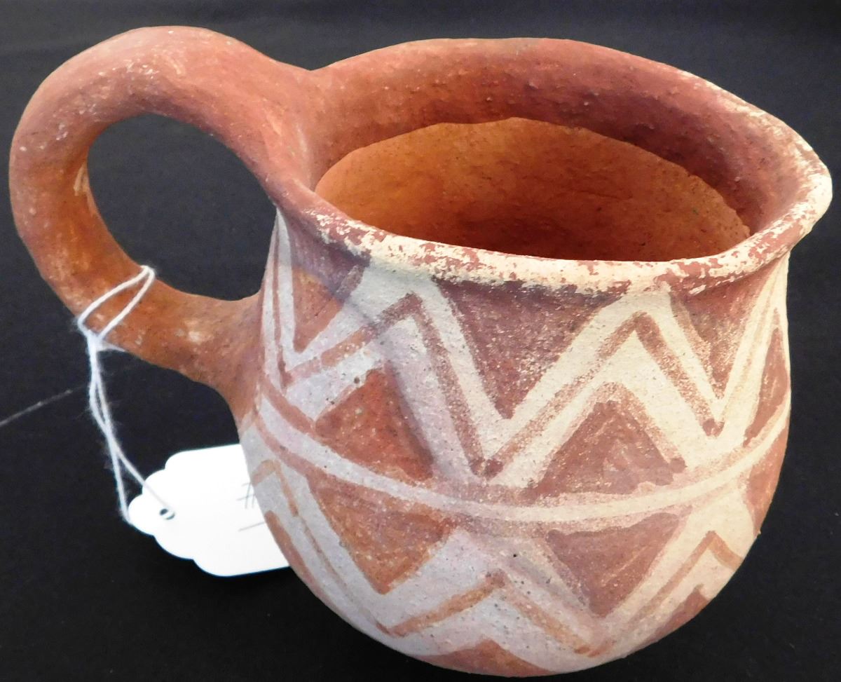 Mojave Pitcher, circa 1890s, made of clay and paint. Item measures 6 x5 inches and is from the Colorado River, California and Arizona area. Condition: Very good, some paint loss on lip, see images. Shipping: $24.00, requires double-box.