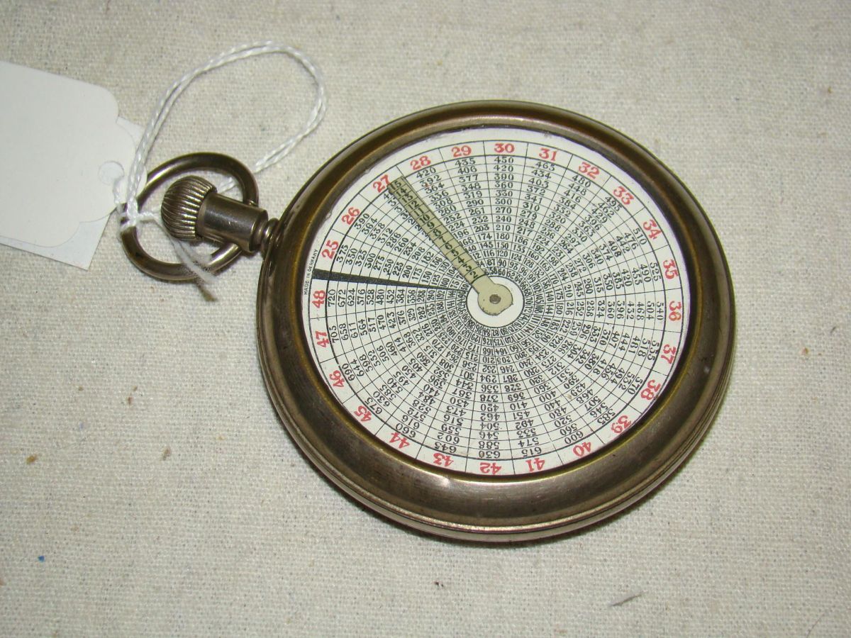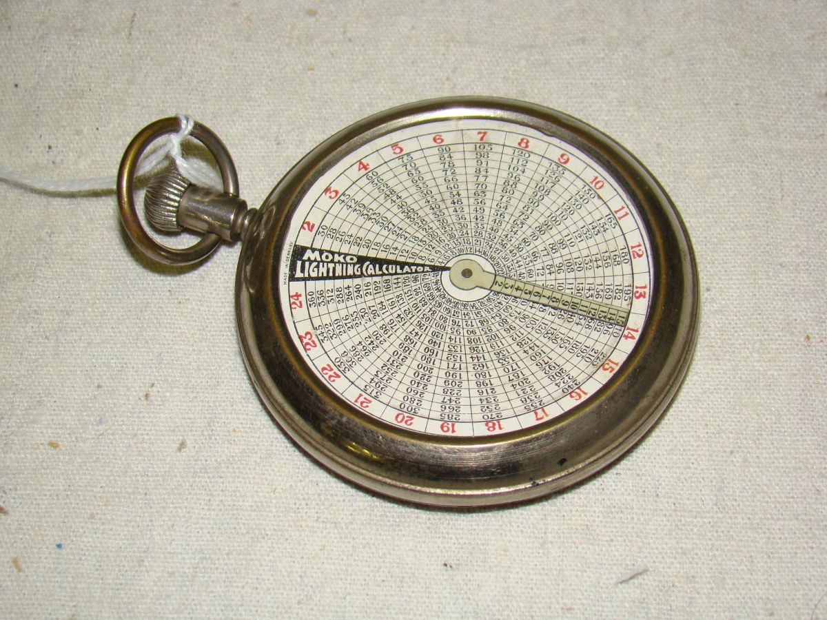 Very rare example of 'MOKE LIGHTNING CALULATOR . Early 20th c. pocket-watch-type two-side calulator : glass covered paper with metal frame. Diameter: