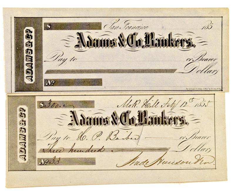 Two Checks from Adams & Co Bankers. One check has not been used and the other comes from Mokelumne Hill, CA and is made payable to C. P. Baker for the sum of $300. Printed by Britton & Ray. Signed by an unknown source. The unused check is in mint condition, the Mokelumne Hill check has a serrated top edge, otherwise unblemished. Both items measure 3” x 7” and are in Very Fine condition.