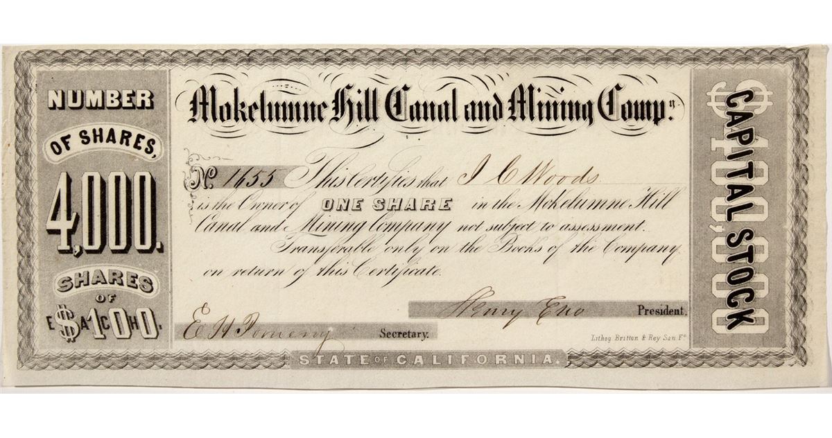Mokelumne was first known as Big Bar in 1848 and was an important business center for the early gold miners in the southern region [Gudde, 1949]. The Mok Hill Canal and Mining Co. is not listed in Browne’s 1868 work covering the district (mineral Resources West of the Rocky Mountains, 1868). It is likely that this company was the predecessor to the Mok Hill and Camp Seco Ditch Co., active in the mid-1860’s. The canal, or ditch, as they were later known, probably brought water to the dry Tertiary channels, known as the Mokelumne Hill Old Channel. It was basically mined out by the mid 1860’s. These certs are rare, but there are about four to six known. They are among the oldest of the Mok Hill certificates.(Prag Collection)