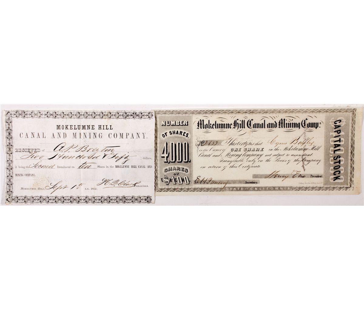 Two pieces from the early California gold rush. 1)The stock certificate was fully issued with not date. Issued in 1854 or earlier as this particular share was part of a group involved in an Adams and Co. lawsuit in Calaveras County in 1854. Issued for one share to Cyrus Bayles and signed by Henry Eno as president and E.H. Pomeroy as secretary. Mokelumne was first known as Big Bar in 1848 and was an important business center for the early gold miners in the southern region [Gudde, 1949]. The Mok Hill Canal and Mining Co. is not listed in Browne’s 1868 work covering the district (mineral Resources West of the Rocky Mountains, 1868). It is likely that this company was the predecessor to the Mok Hill and Camp Seco Ditch Co., active in the mid-1860’s. The canal, or ditch, as they were later known, probably brought water to the dry Tertiary channels, known as the Mokelumne Hill Old Channel. It was basically mined out by the mid 1860’s. These certs are rare, but there are about four to six known. They are among the oldest of the Mok Hill certificates. 2) A purchase receipt from the Mokelumne Hill Canal and Mining Company: received of A.P. Breyton $250 dollars, it being the second installment on ten shares in the company. Dated Sept. 1, 1852. Signed by H.L. Clark the company treasurer. Fold lines and browning on the verso. VF. -61677