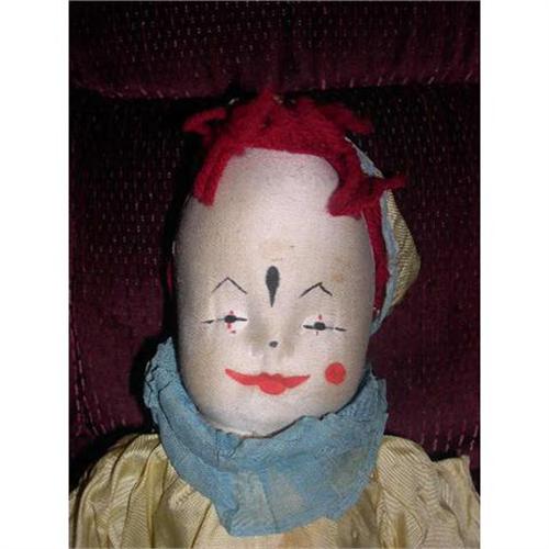 Molded Face Cloth Clown. Doll has painted features and old original clothes. Few stains to outfit and holes in hat. Soil to face with mitten type hands. Doll can sit. Comes from smoke free environment. Buyer to pay $10 for shipping, insurance and handling. Thanks for viewing.