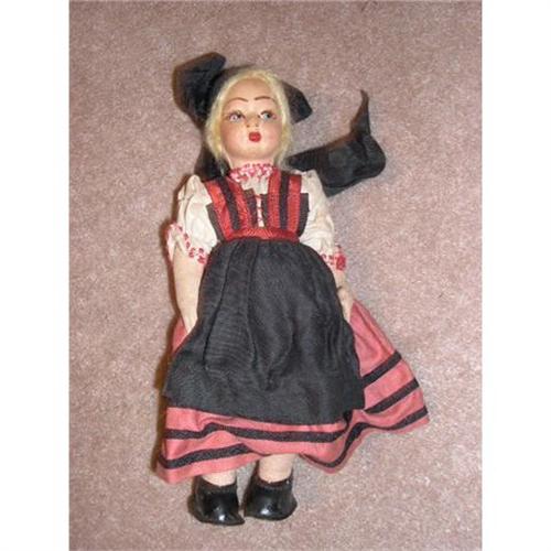 This doll is 9" tall and has a molded face. She has lots of painted upper eyelashes and then has the red dots in the eyes and in the nostrils. She has mitten type hands with the stitching lines to represent the fingers. She has a black felt beanie type hat stitched to her head and a large black bow with ribbons which makes me thing she is from France or a neighboring coutry due to the large bow. Her outfit is nice, she has a slip and panties. There are some rust marks on them from an old stand. There are no rips, tears, or holes in the dolls. She has black shoes. She has moveable legs so the doll can sit. This piece is from a smoke free environment. Buyer t opay $8 for U.S. shipping, insurance, and handling. Thanks for viewing.