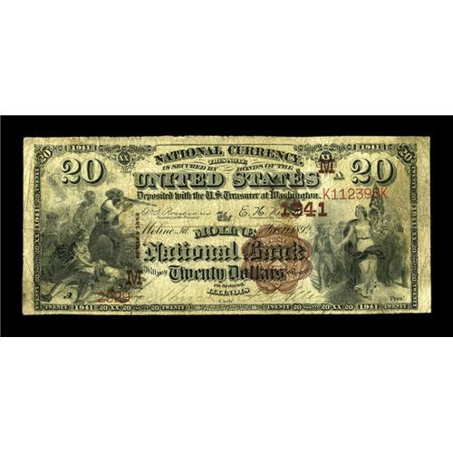 <B>Moline, IL</B></I> - $20 1882 Brown Back Fr. 499 <B>The Moline NB</B></I> Ch. # (M)1941<BR>An excessively rare note which was formerly part of the Shaw collection. It comes from a bank with just two examples extant, one of which has never been offered for sale and the other this piece, which has been offered at public sale only once. Moline is by far the largest community in Illinois that remains just about unobtainable to collectors, a fact demonstrated by the realization for this note when we sold it back in September of 2000, when it realized $11,000 in spirited bidding. We don't believe that sum is attainable tonight, as another example is now known from here, but a realization in the area of two thirds that number for this pen signed <B>Fine</B></I> Brown Back is certainly a real possibility.<BR><I>From The Lincoln Collection</B></I><BR><BR><b>Shipping:</b> Coins & Currency (<a target="_blank" href="http://www.heritageauctions.com/common/shipping.php">view shipping information</a>)