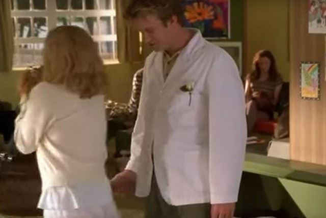 Molly (1999)- Sam (Thomas Jane) screen worn, golden yellow silk ripped polo short sleeve sweater with urban outfitters olive twill, flat front no cuff pants. Worn during his first scene in the film.
