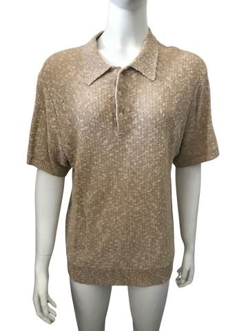 Molly (1999)- Sam (Thomas Jane) screen, worn tan colored woven short sleeve polo shirt with three buttons. Worn with the olive colored flat front pants and a celery colored cardigan from another costume in the film. Includes costume department wardrobe tag.