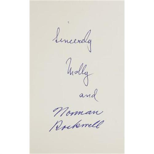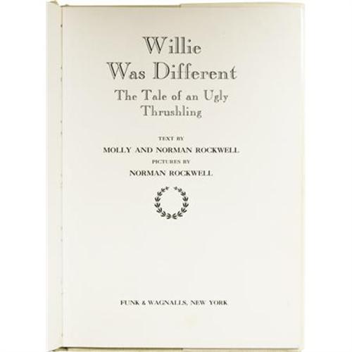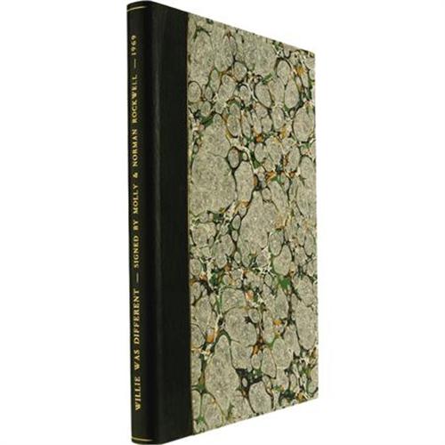 <B>Molly and Norman Rockwell: Signed </B></I><I>Willie Was Different: The Tale of an Ugly Thrushling.</B></I> Text by Molly and Norman Rockwell. Pictures by Norman Rockwell. (New York: Funk & Wagnalls, 1969), first edition, 42 pages, tan cloth binding with gilt and red spine titles and gilt decoration on the front board, 8vo (7.25" x 10.25"), price-clipped dust jacket (in protective Mylar), housed in a green quarter leather slipcase with marbled boards and gilt titles on the spine. On the half-title page, Molly signs "<I>Sincerely Molly and</B></I>" then, underneath, Norman signs in full "<I>Norman Rockwell</B></I>". The Rockwells' ugly duckling tale <I>Willie Was Different</B></I> is the story of an ugly thrushling who, quite literally, finds his own unique voice, a singing voice to be exact. The story has delighted children of all ages since its publication over 40 years ago. The book presented here is in very good condition in a good dust jacket that has noticeable tape repair to both sides of the front panel.<BR><BR><b>Shipping:</b> Books & Catalogs (<a target="_blank" href="http://www.heritageauctions.com/common/shipping.php">view shipping information</a>)