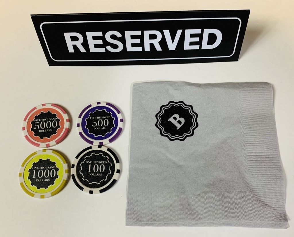 Original collection of props used on the poker table including 4 chips, a reserved sign and a "B" napkin used on the production of 'Molly's Game' (2017), the poker crime drama movie of the true story of Molly Bloom, an Olympic-class skier who ran the world's most exclusive high-stakes poker game and became an FBI target.