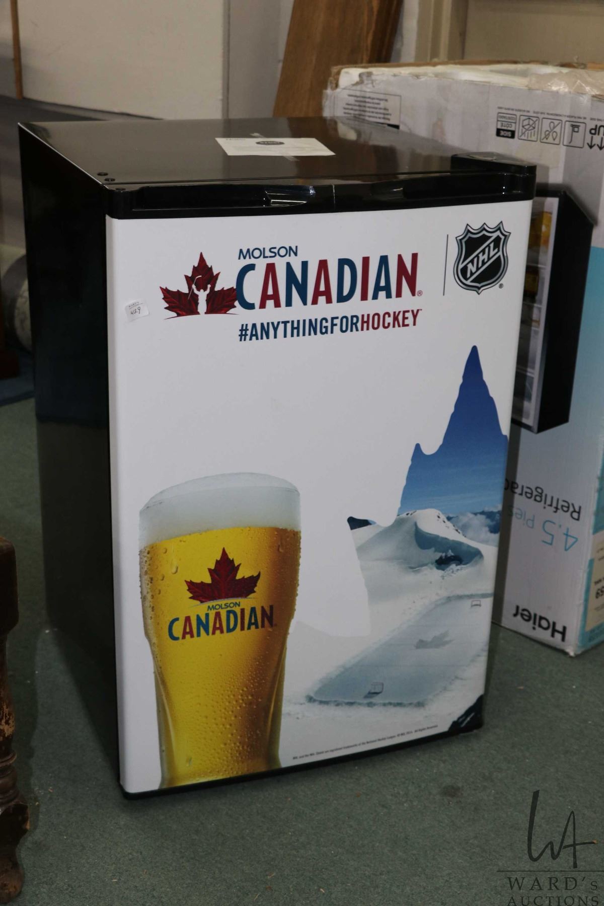 Molson Canadian motif 4.5 cubic ft. refrigerator, appears unused. Note: Not available for shipping. Local pickup only