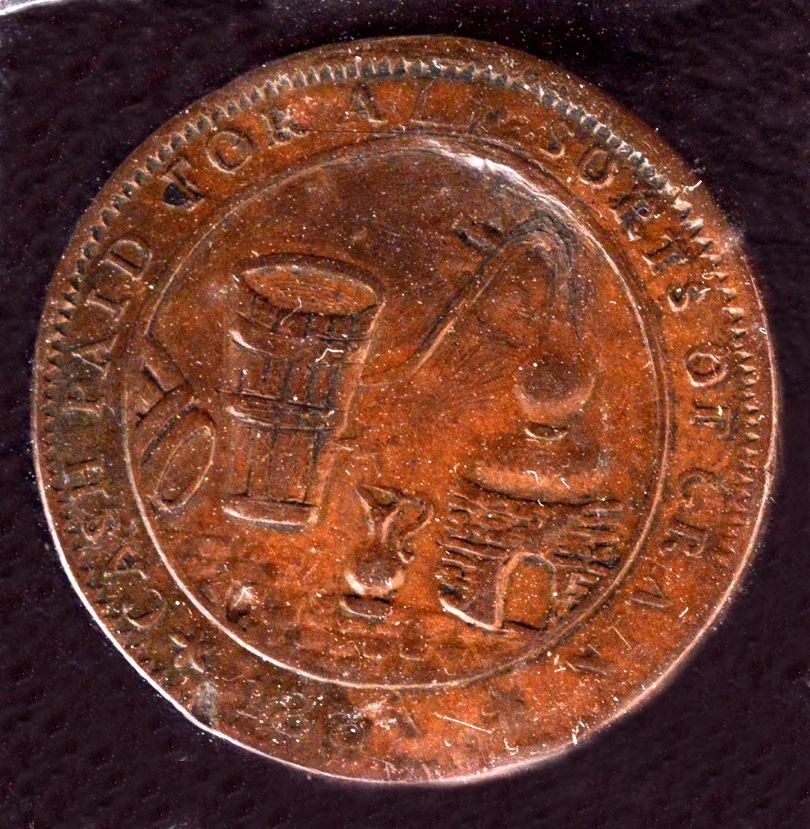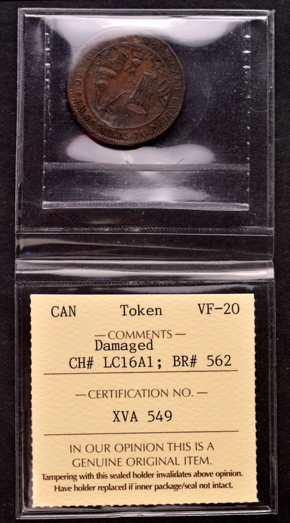 Lower Canada, Ths & Wm Molson Montreal Brewers, Un Sou, 1837, Br.562, LC-16A1, HW108, graded by ICCS VF-20, but with comment Damaged. It has been holed and plugged. Still, a decent example for a hole filler. Listed in the U.S. Hard Times token series.