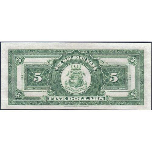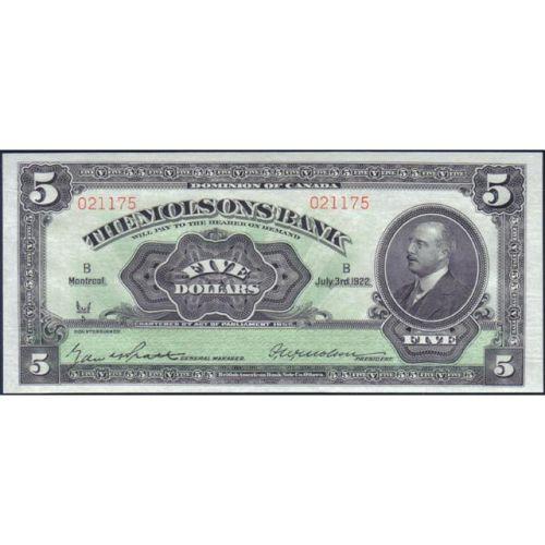 Molsons Bank Five Dollars 1922, CH 490-40-02, Serial Number 021175 B, PMG Gem Uncirculated-65 EPQ. Slightly bias cut