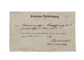 HELMUTH KARL BERNHARD GRAF CO MOLTKE (1800-1891) German soldier. Moltke served as chief of staff for the Prussian Army for thirty years, and is widely regarded as one of the great military strategists of his time. Partially Printed Document Signed, “ H. v. Moltke.” One page, 7” x 4 1/4”. Berlin. May 28, 1873. The document grants permission to take a volume out of the Reichstag Library. Document affixed to cardboard backing. Else Very Good.