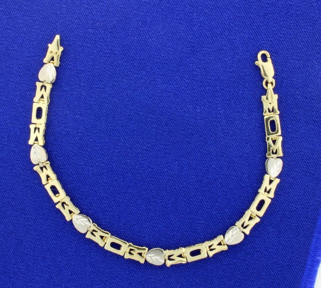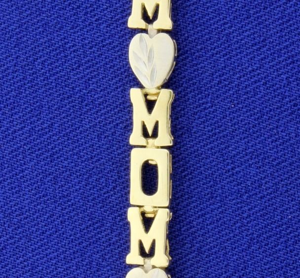 In 14K yellow and white gold, the hearts have a etched design on them. The bracelet is 4.5mm wide. 7.2g
