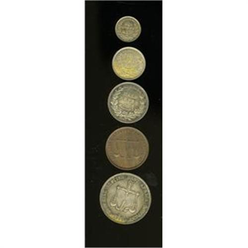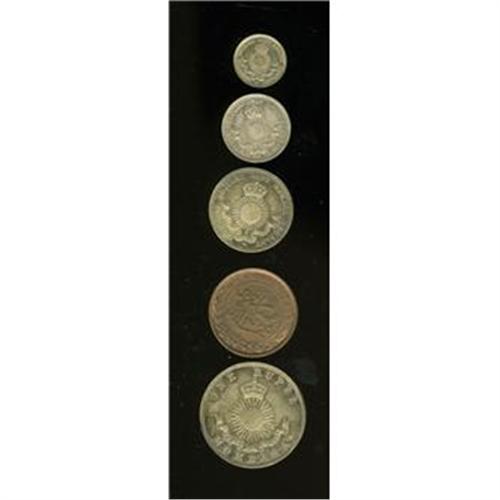 <B>British Colonial. Complete Country!, </B></I>KM1.5 Pice 1888-CM medium letters, AU-UNC, some original luster, KM2 2 Annas 1890H, toned AU, KM3 1/4 Rupee 1890H, toned AU-UNC, large scrape on the obverse, KM4 1/2 Rupee 1890H, prooflike AU-UNC, lovely patina, and KM5 Rupee 1888H, toned AU-UNC, prooflike surfaces, some noticeable hairlines. <B>Sold as is, no return lot.</B></I><BR><BR><b>Shipping:</b> Coins & Currency (<a target="_blank" href="http://www.heritageauctions.com/common/shipping.php">view shipping information</a>)